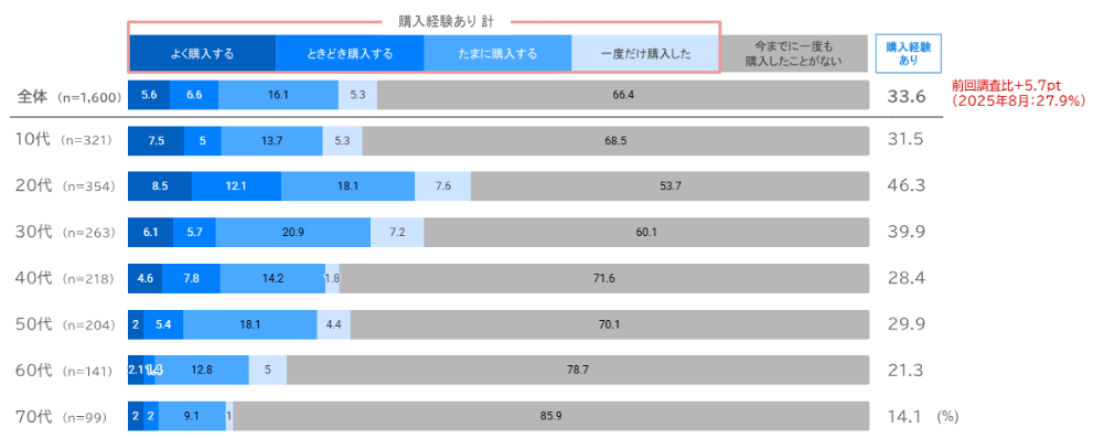 SNSをきっかけとした購入経験率は、Instagram(33.6%、前回比+5.7pt)、TikTok(32.9%、+4.4pt)、X(30.7%、+3.4pt)、YouTube(29.3%、+3.7pt)と軒並み上昇。SNSが「買うきっかけ」を生むメディアとしての存在感を高めている。