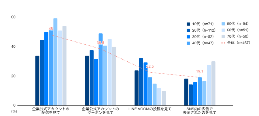 購入を決定した情報源として、TikTokは「おすすめに表示された投稿」(47.2%)が最多であった。一方、Instagram(50.1%)、X(47%)、YouTube(50.5%)では「フォローしているアカウントの投稿」が最も影響を与えており、プラットフォームの特性に応じた購入導線の違いが明確になった。LINEでは「企業公式アカウントの配信」(48%)と「クーポン」(38.5%)が上位を占め、ダイレクトなアプローチが有効であることがわかった。