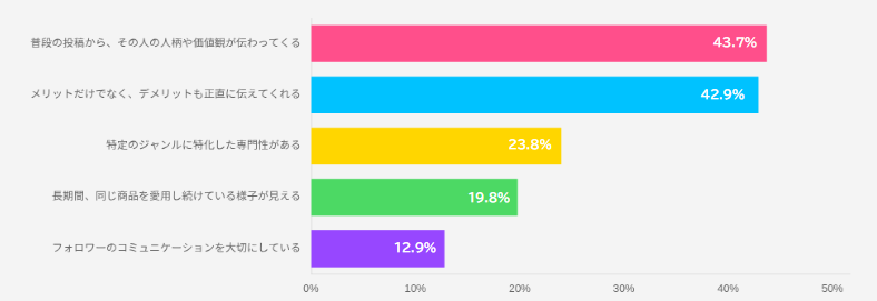 前述のインフルエンサーマーケティング調査で「信頼できるインフルエンサーの特徴」を尋ねたところ、「人柄や価値観が伝わる投稿をしている」が43.7%、「メリットだけでなくデメリットも正直に伝えている」が42.9%で上位を占めました。さらに「その分野の専門知識がある」が23.8%、「長期間その商品を愛用している」が19.8%と続いています。