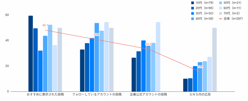 TikTokの本質は、アルゴリズムによる「偶然の出会い」を演出するプラットフォームであることです。私たちの調査データが、この特性を明確に裏付けています。TikTokで商品・サービスの購入を決めた要因として、「おすすめに表示された投稿」が48.1%で最多となりました。これはInstagramの39.5%、Xの43.0%を上回る数値です。