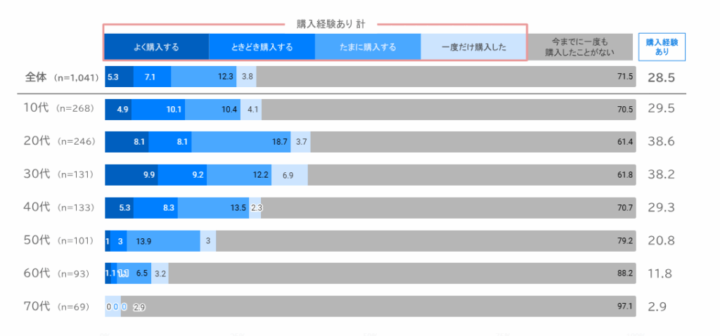 さらに興味深いのは、年代別の購入経験率です。20代では38.6%、30代では38.2%という高い数値を記録しており、購買意欲が高いとされる層にしっかりとリーチできていることがわかります。