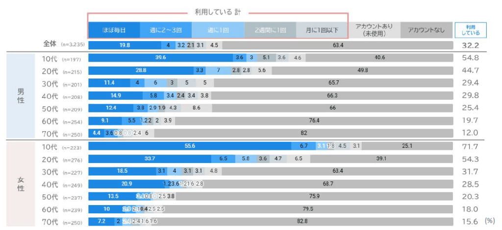 この表が示す通り、10〜20代の利用率が高い一方で、30代、40代でも約3割と、ビジネスの中核を担う世代も積極的に利用していることがわかります。